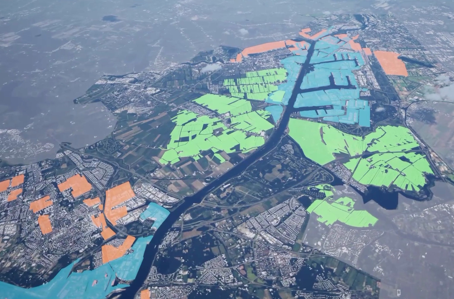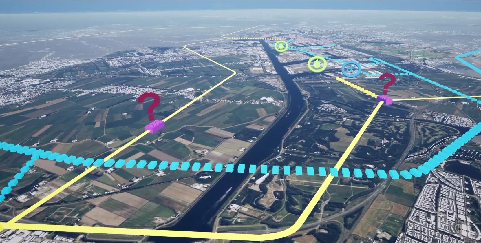Het zicht begint vanaf de Noordzee; dit past het beste bij het aanzicht van waaruit de klant het wil beschrijven. Hierna volgt een fly-through door het gebied waarbij met behulp van iconen en vlakken de opgaven oplichten rond een gezondere leefomgeving en een nieuwe energie-infrastructuur.